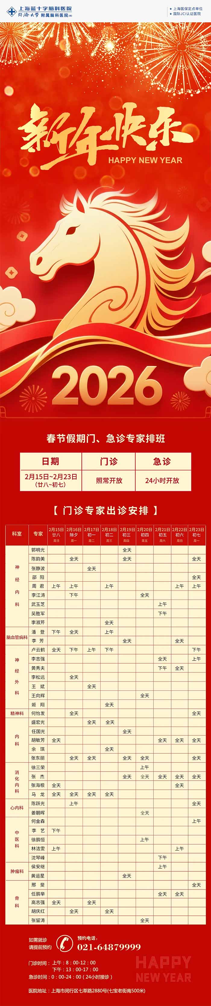 马蹄声声迎春到,健康岁岁伴君行。在这万家灯火、亲情融融的美好时节,上海蓝十字脑科医院【同济大学附属脑科医院(筹)】始终与您同行,用专业与温情守护您的健康之路。根据国务院办公厅放假安排,结合我院实际情况,2026年2月15日(年二十八)至2月23日(正月初七)春节假期期间,我院门、急诊照常开诊。门、急诊安排详情如下: