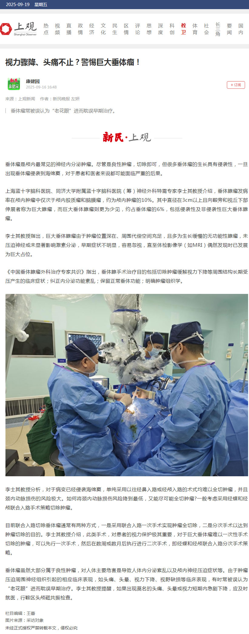 垂体瘤虽然大部分属于良性肿瘤,对人体主要危害是导致人体内分泌紊乱以及颅内神经压迫症状等。由于肿瘤压迫周围神经组织引起的相应临床表现,如头痛、头晕、视力下降、视野缺损等临床表现,有时常被误认为“老花眼”进而耽误早期治疗。李士其教授提醒,如果出现莫名的头痛、头晕或视力短期内急剧下降,应及时就医,行鞍区头颅磁共振检查。