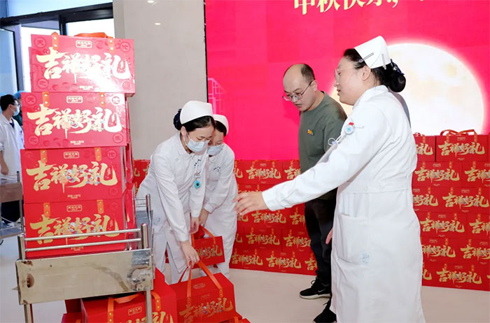 书记朱敏和院长项耀钧等院领导心系职工,来到门诊大厅与大家亲切交谈,逐一将象征着“团圆美满”的月饼礼盒送到各科室员工代表手中,致以节日的诚挚问候。每一份礼盒都满载着医院的深切关怀与诚挚祝福,让大家感受到了节日的喜悦,更体会到了“蓝十字”大家庭的温暖。