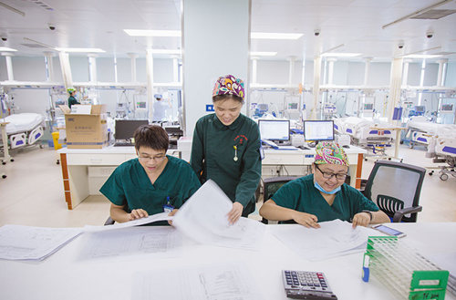 丁腊梅(右一)与护士长张棕智及同事一起整理患者监护记录
